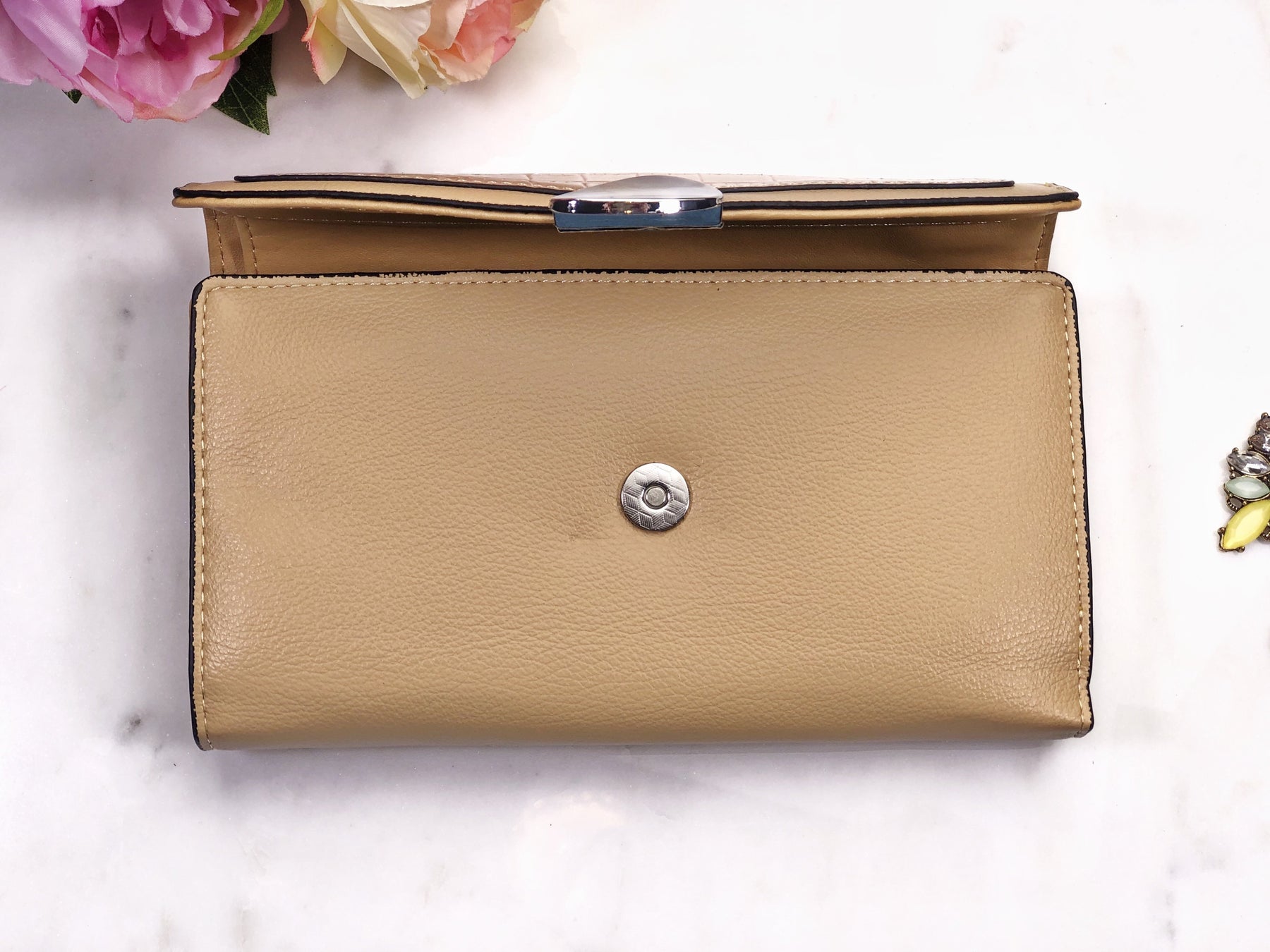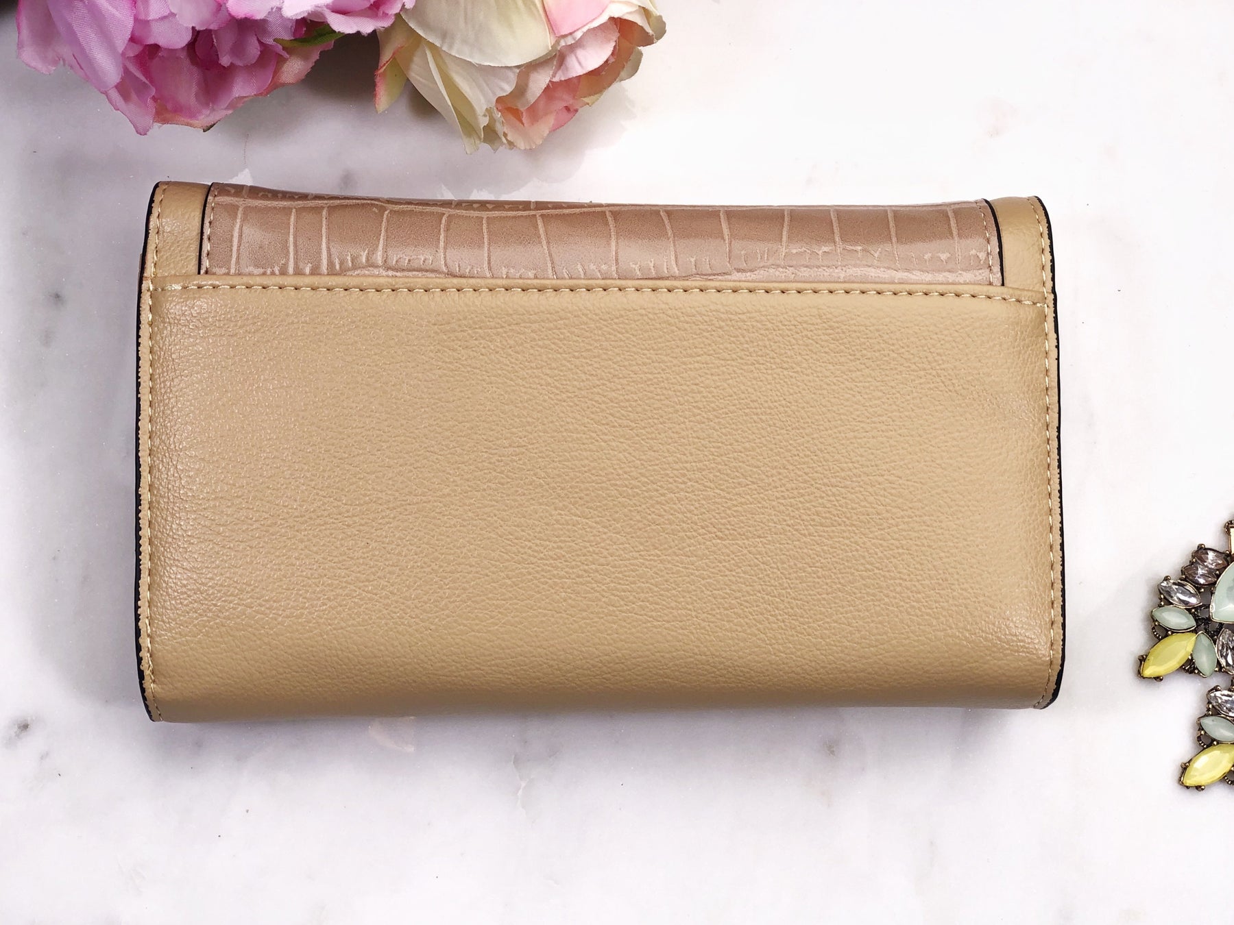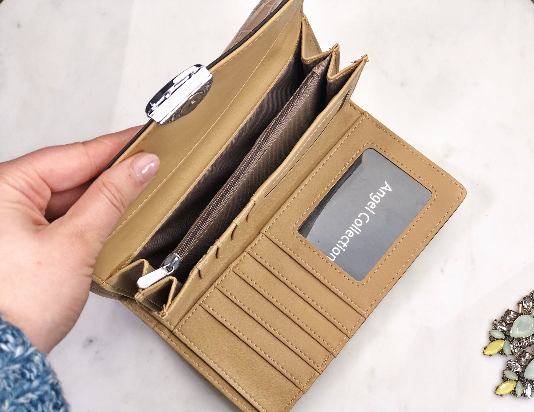 Nici nu ai crede că portofelul Eunice este din piele ecologică! Materialul de cea mai bună calitate îi conferă o textură foarte plăcută la atingere iar finisajele și detaliile fine își vor păstra aspectul mult timp. Contrastul dintre pielea ecologică ușor texturată și cea cu imprimeu croco fac portofelul un accesoriu foarte stilat. În interior vei descoperi o mulțime de compartimente pentru carduri, un buzunar cu fermoar și 2 compartimente libere. Portofelul se închide cu un magnet mascat de un accesoriu metallic.