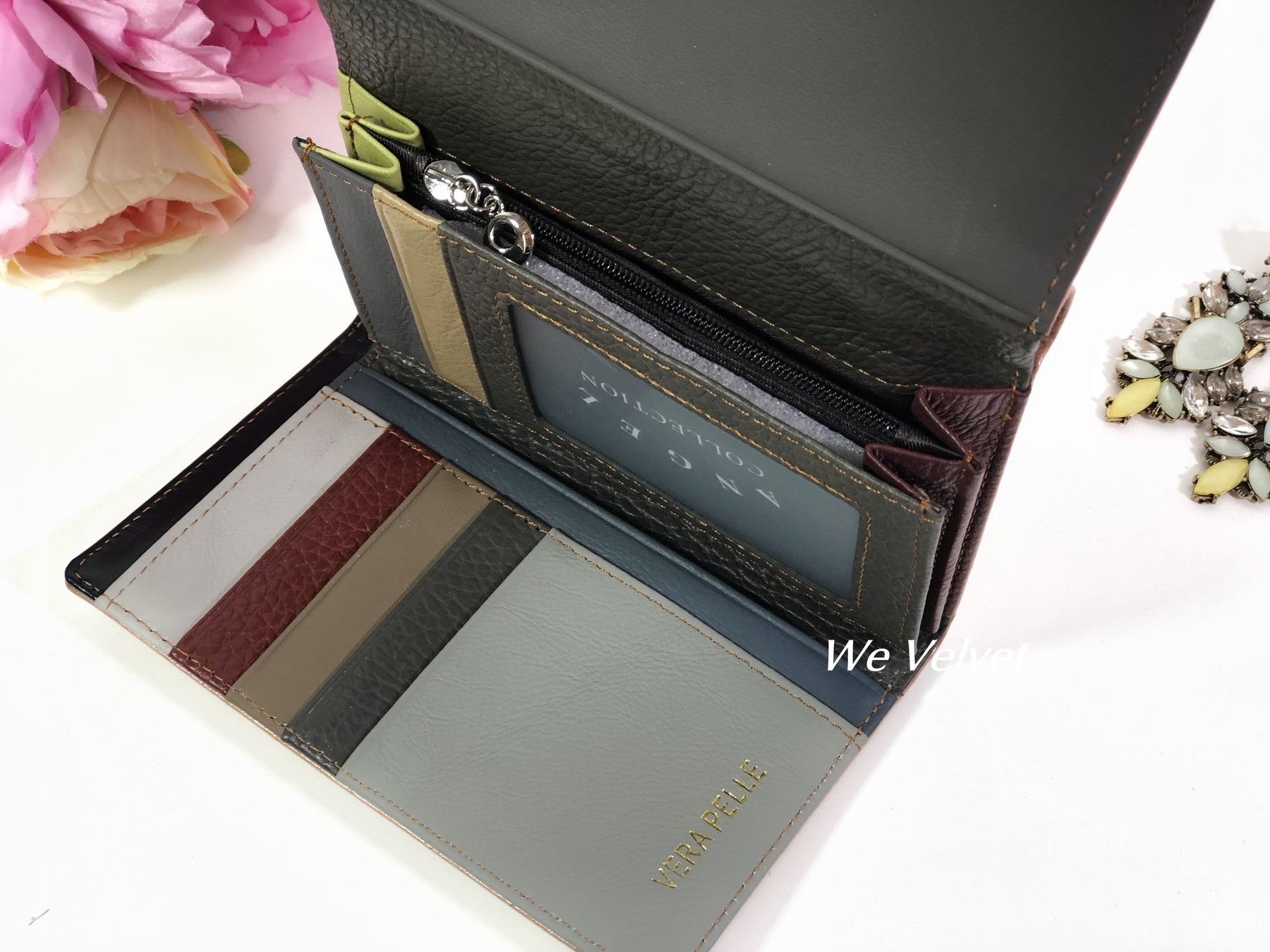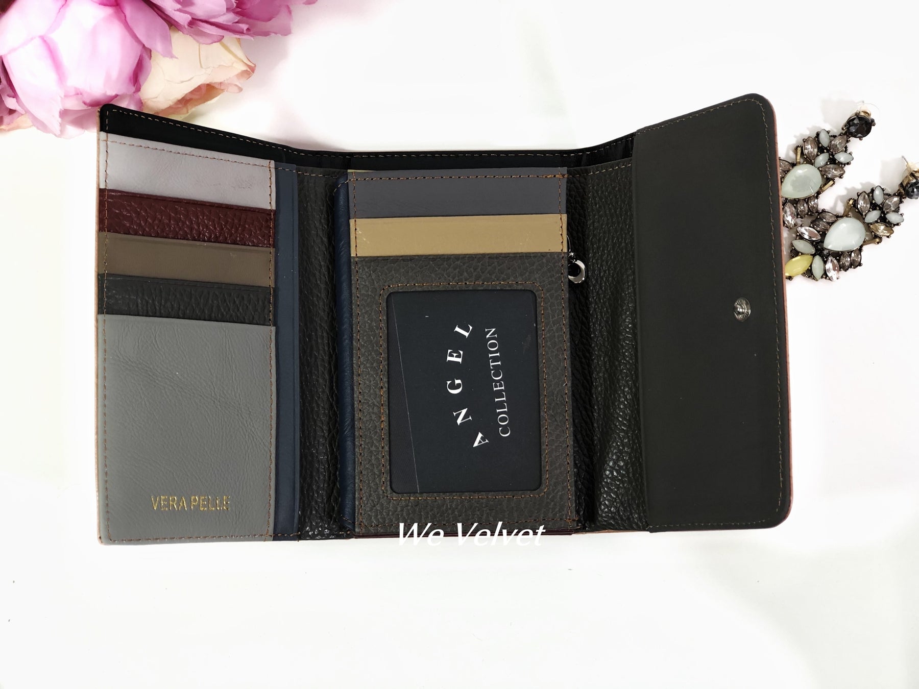 • La interior dispune de 7 compartimente pentru carduri, 4 compartimente pentru documente, un compartiment pentru bancnote și un buzunar separat cu fermoar pentru monede