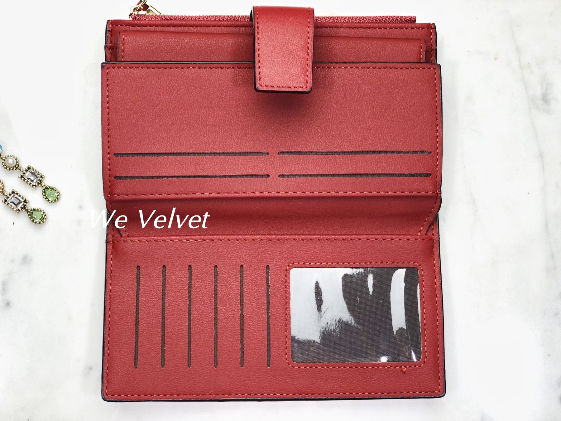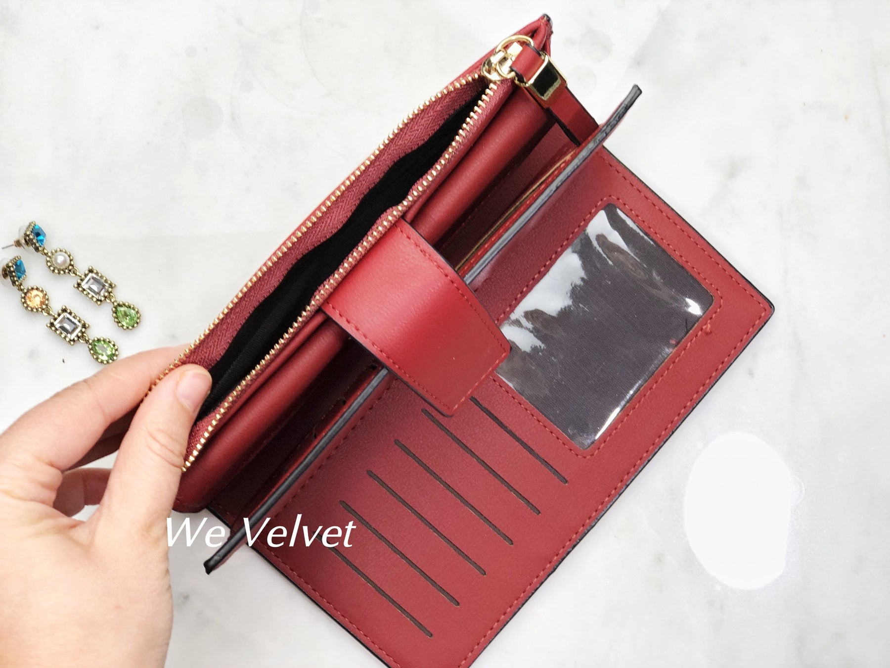 • Dispune de 16 compartimente pentru carduri, 3 compartimente pentru bancnote, un buzunar cu capsă și un buzunar cu fermoar pentru monede