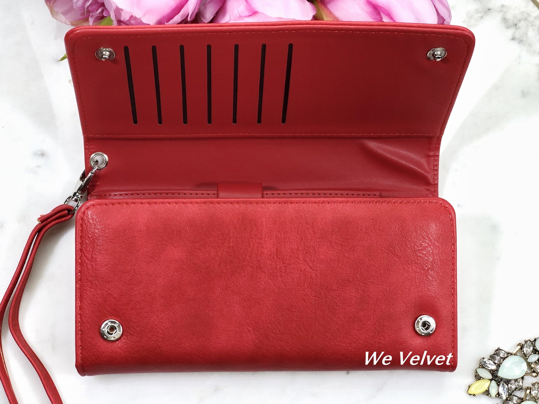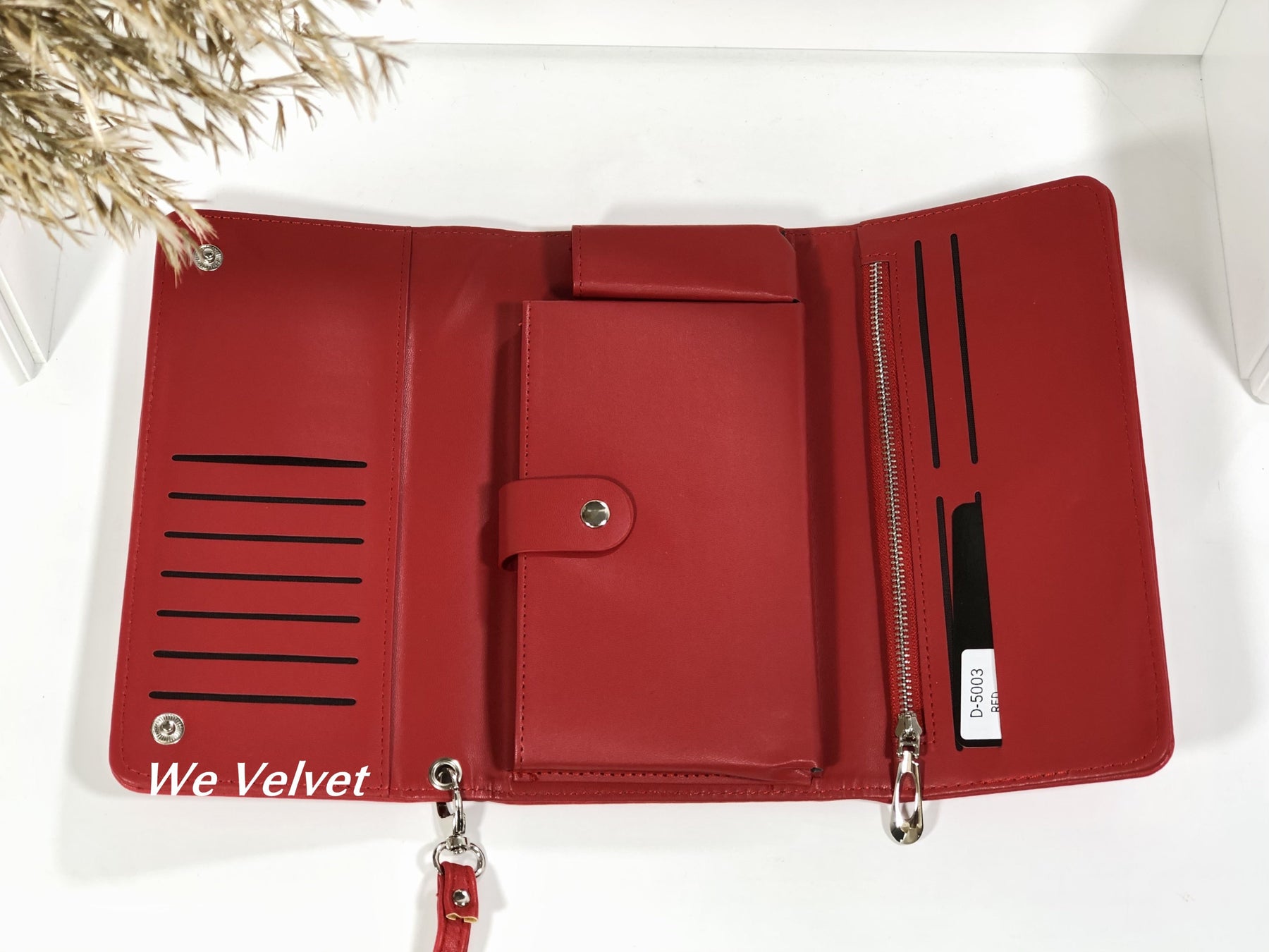• Dispune de 11 compartimente pentru carduri, 2 compartimente pentru bancnote, un buzunar cu fermoar, un compartiment liber și un compartiment cu capsă.
