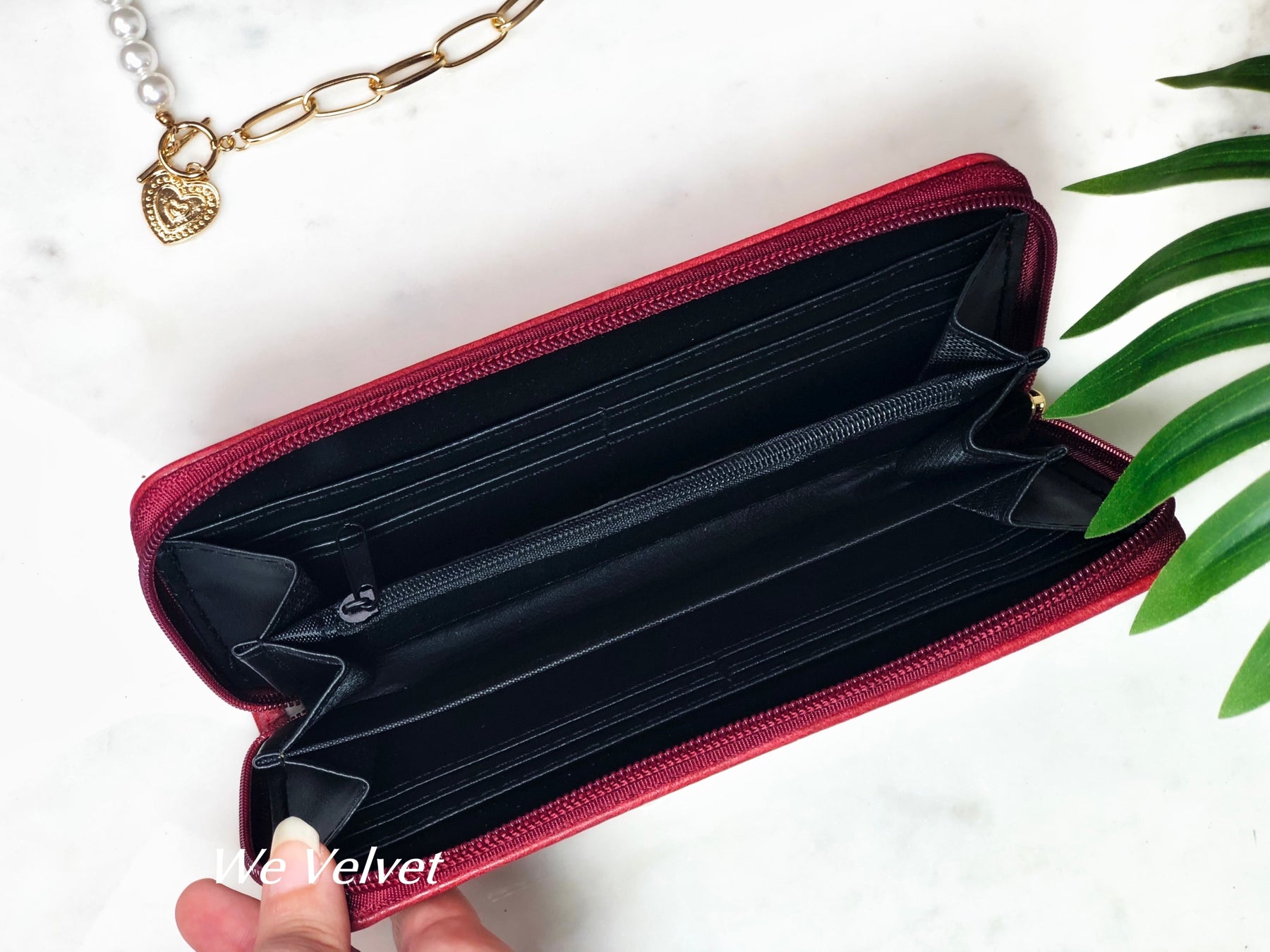 • Dispune de 8 compartimente pentru carduri, 5 compartimente pentru documente și bancnote și un buzunar cu fermoar pentru monede