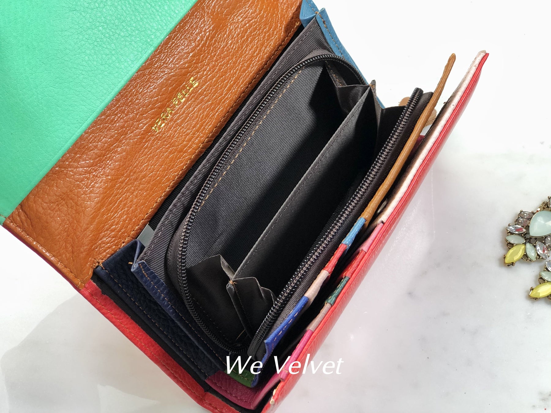 • Portofelul dispune de 9 compartimente pentru carduri și documente, un buzunar interior cu fermoar și 3 compartimente libere