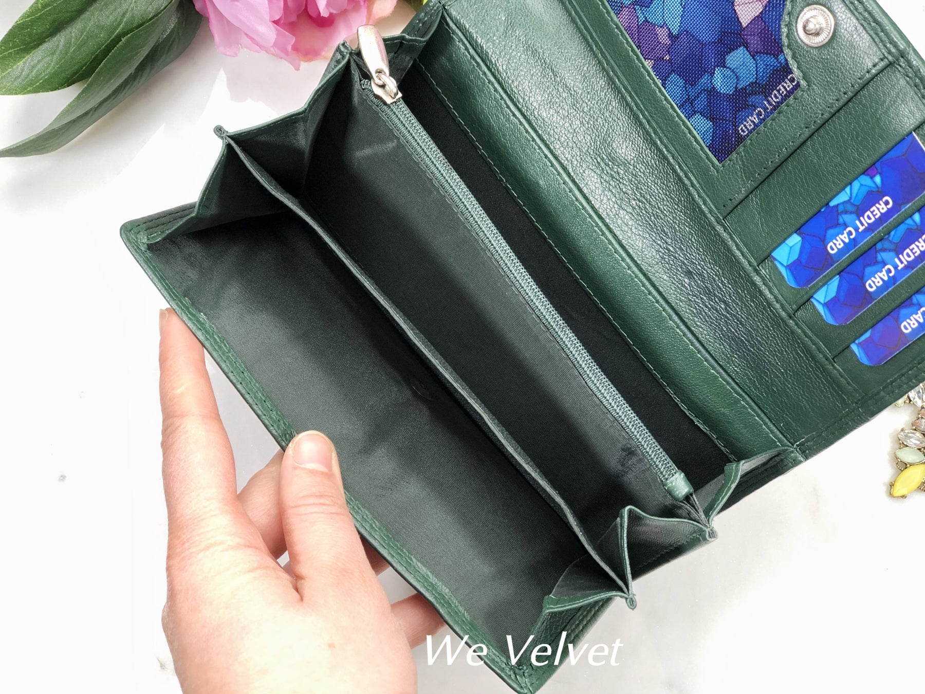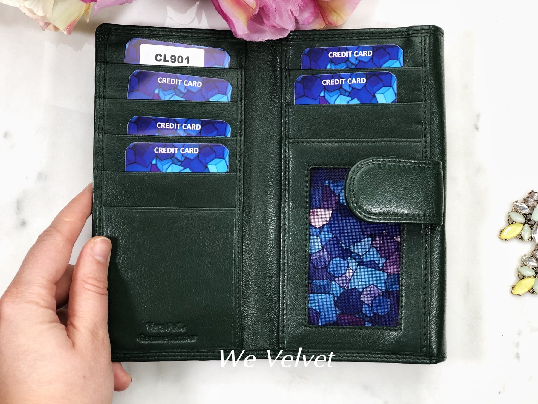 • Dispune de 12 compartimente pentru carduri și documente, 7 compartimente pentru bancnote și un compartimente cu fermoar pentru monede