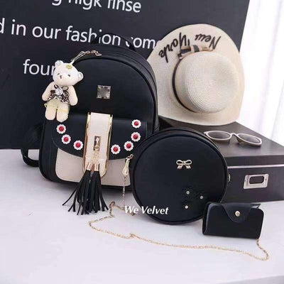 Setul Oxana este un model foarte cochet și drăgălaș pe care îl recomandăm purtării zilnice asortat cu ținute casual. Partea și mai frumoasă la acest rucsac este că acesta vine împreună cu o poșetuță care poate fi purtată separat și un mini portofel pentru cărți de vizită, dar și ursulețul din poză. Vei reuși să te organizezi perfect cu setul acesta ❤️