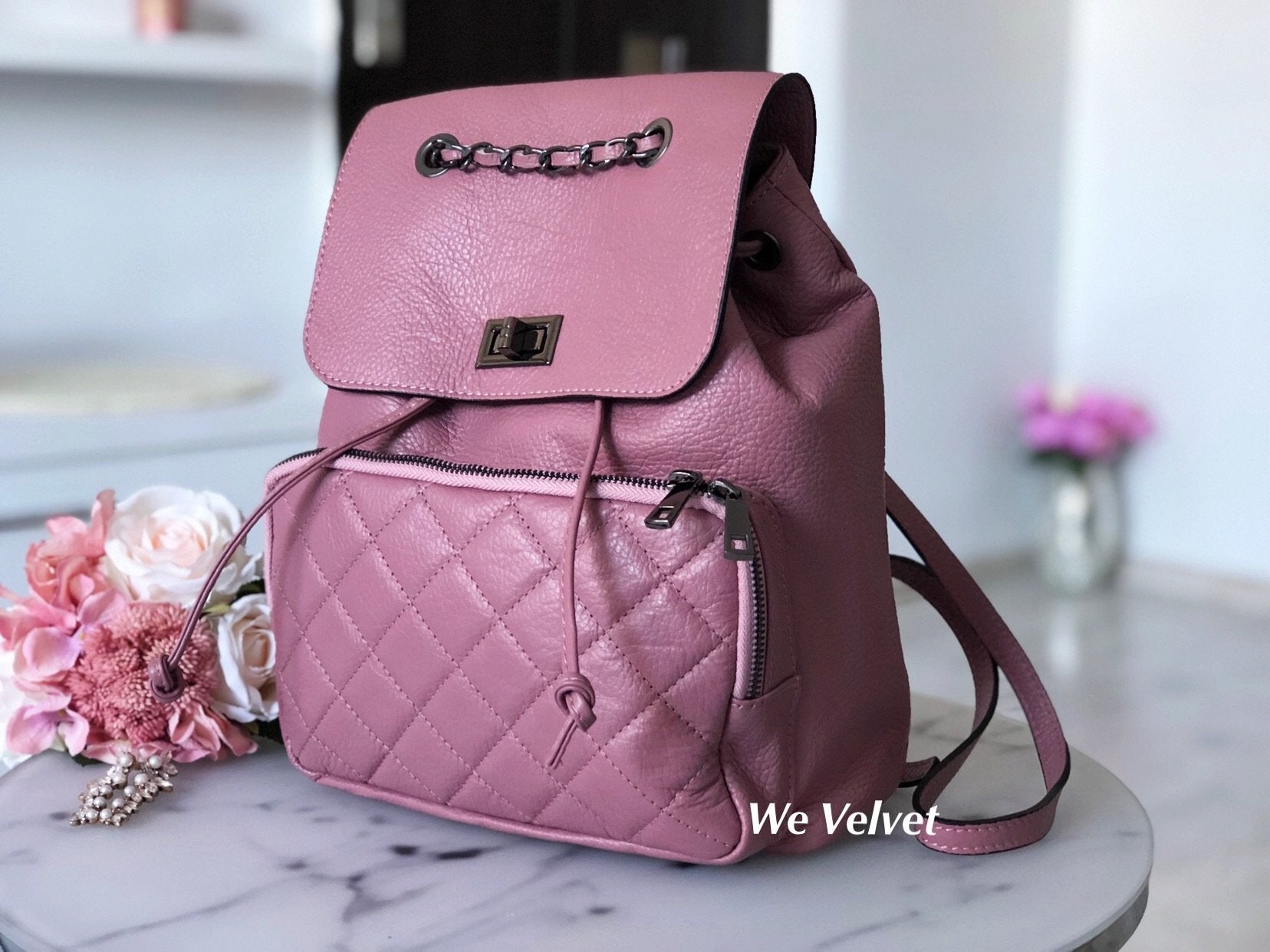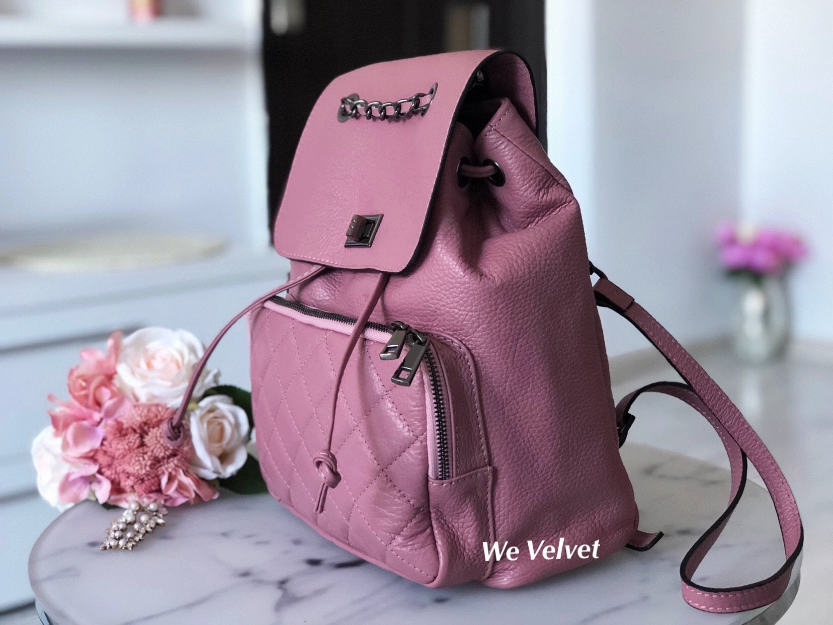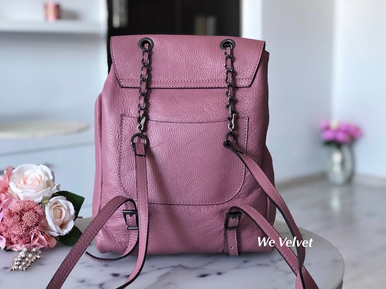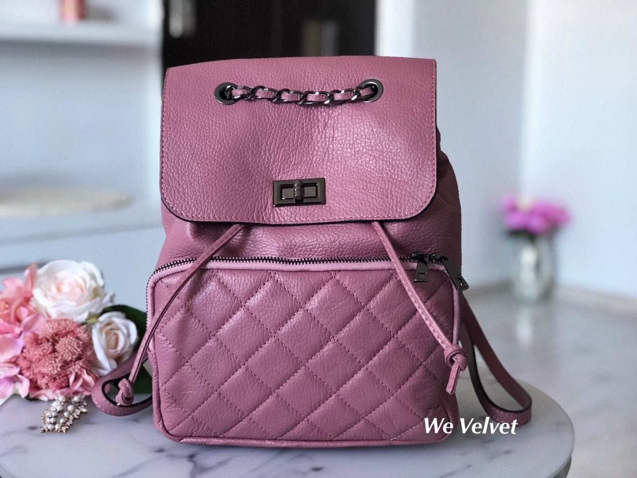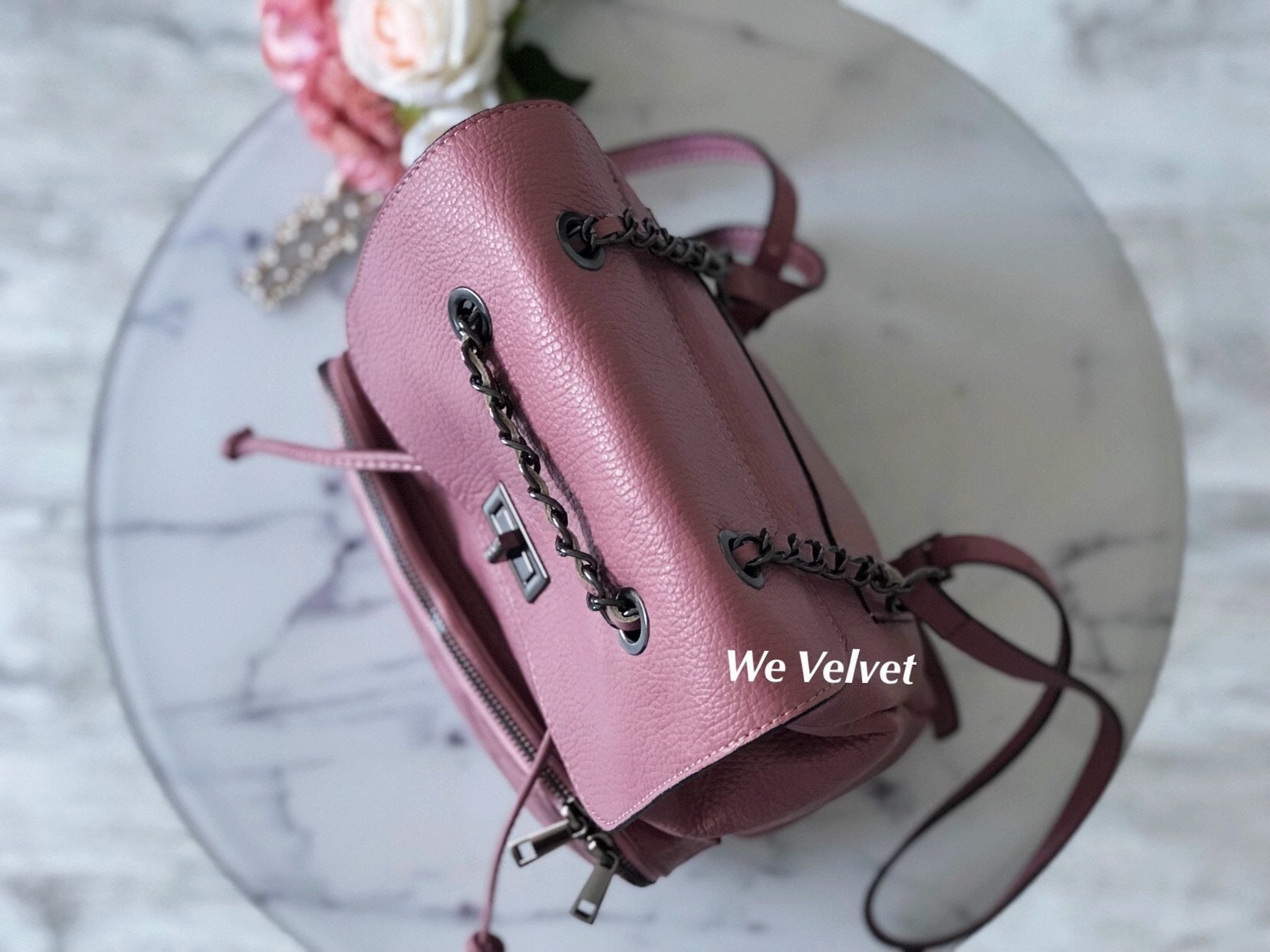 - Se poate purta atât în mână, cu ajutorul mânerului din lanţ, dar şi pe umăr, datorită bretelelor reglabile.