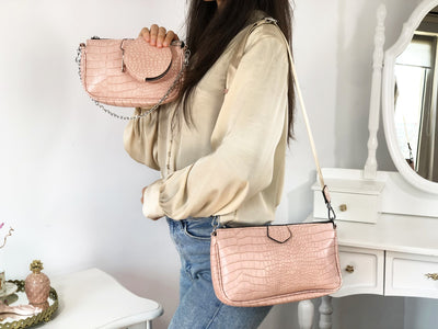 Colecția de trei gentuțe din piele ecologică de înaltă calitate, cu imprimeu croco te va încânta de la prima purtare! Le poți purta împreună, pentru extra spațiu dar și separate, ca borsetă sau mini gentuță și portofel!