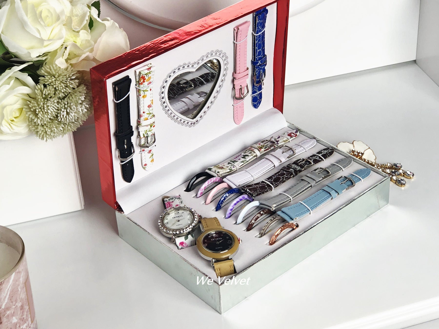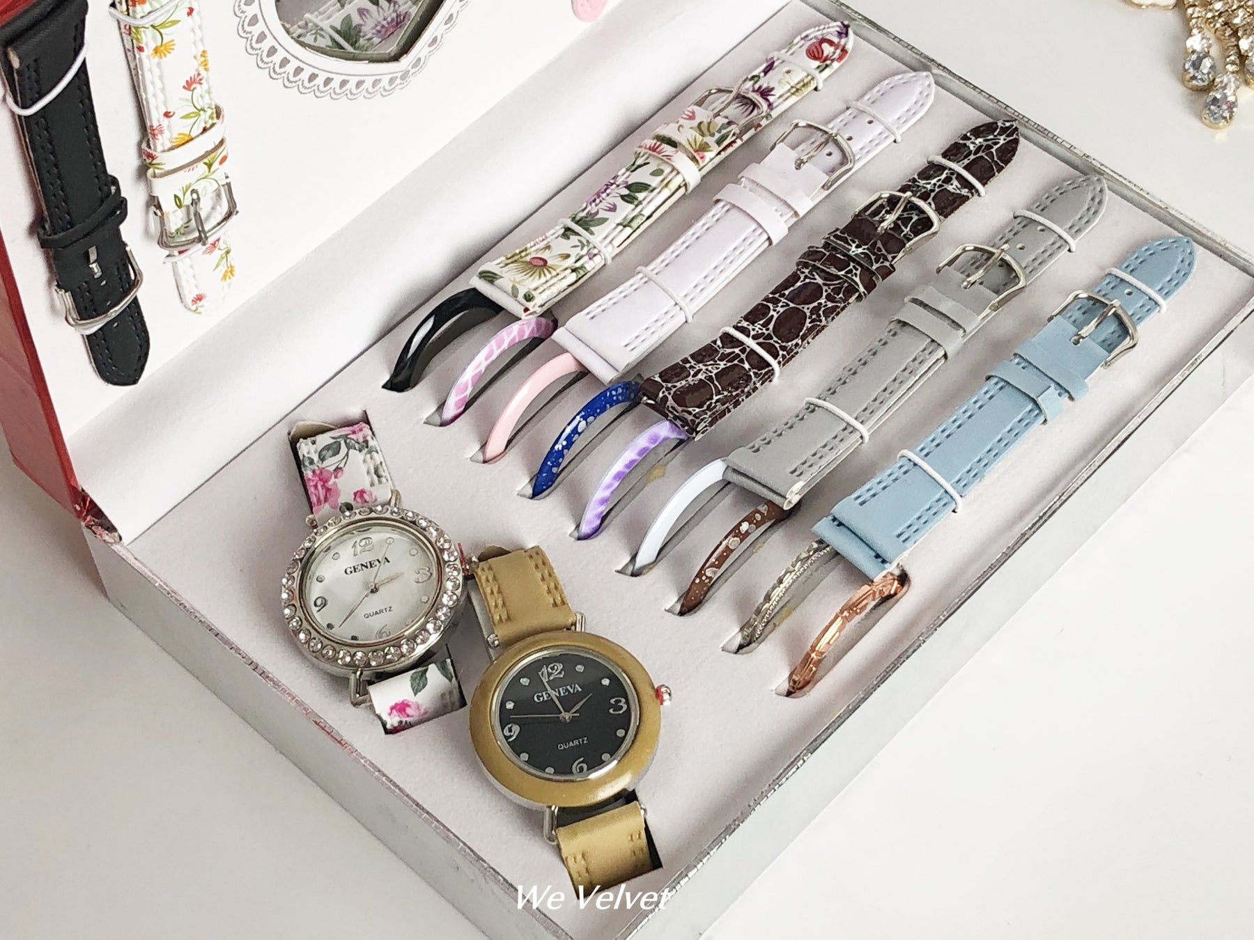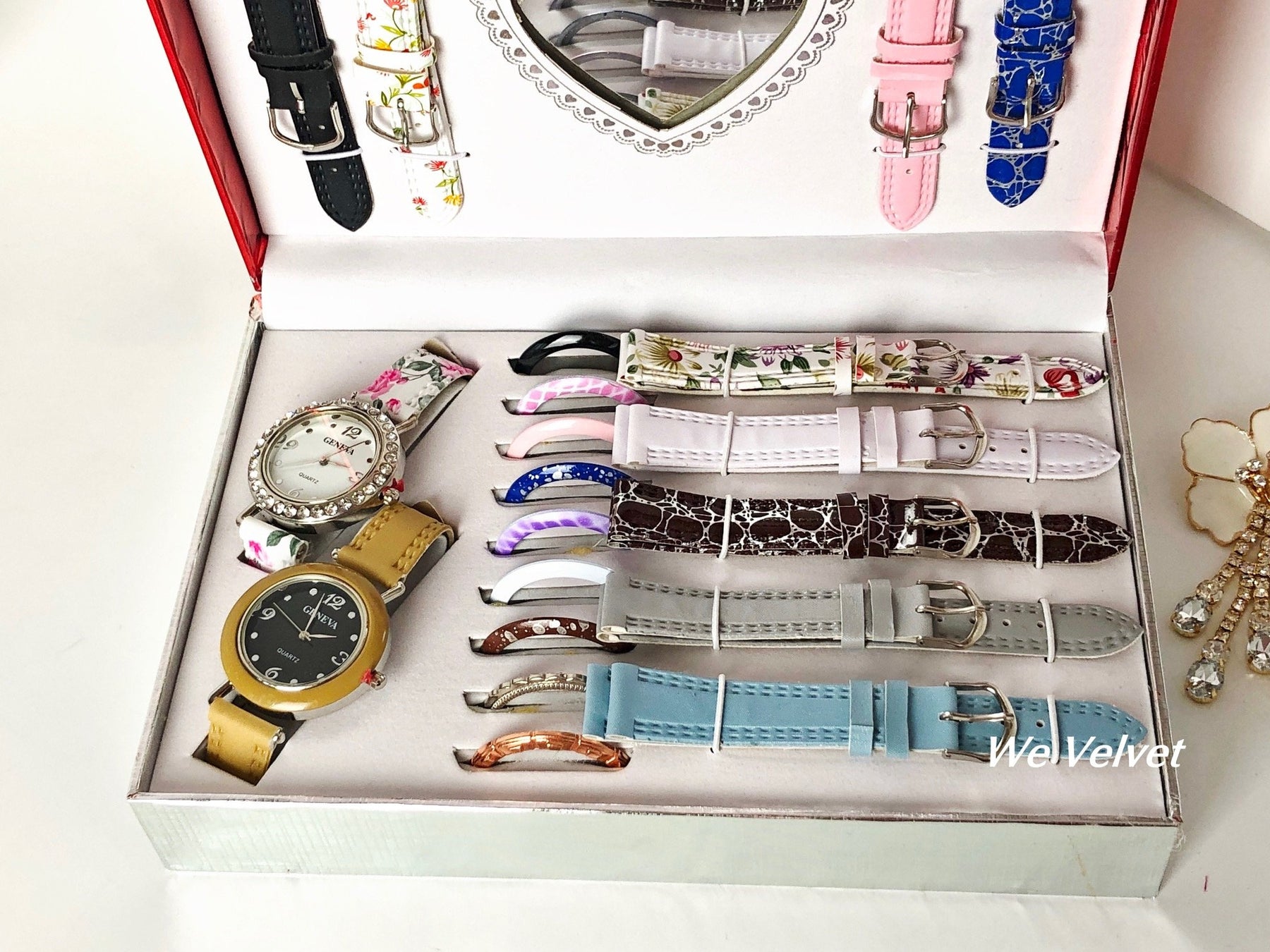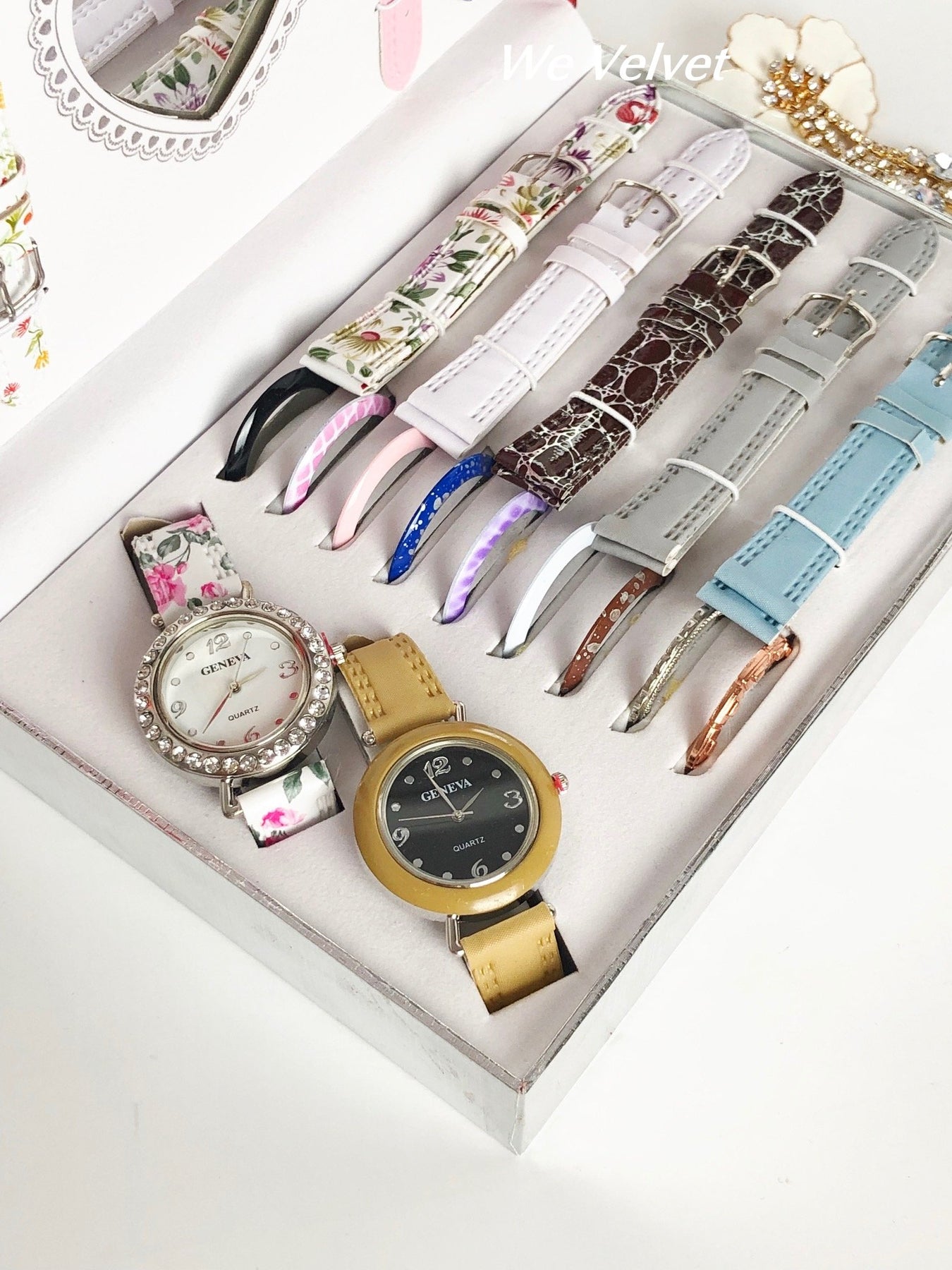 Acest set este atât de practic și de drăgălaș încât persoana care îl va primi se va îndrăgosti de el de la prima vedere! Cele două ceasuri vin împreună cu 11 curele și 11 cadrane inedite, care se pot schimba în funcție de outfit.