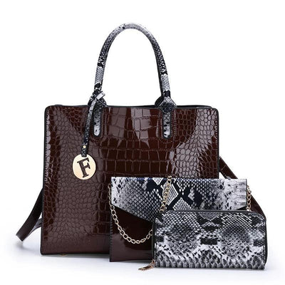 Set geantă coffee piele eco lăcuită cu poșetuță și portofel Frida