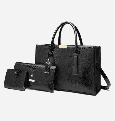 Set geantă neagră piele eco lăcuită cu portfard și mini portofel Kalisha