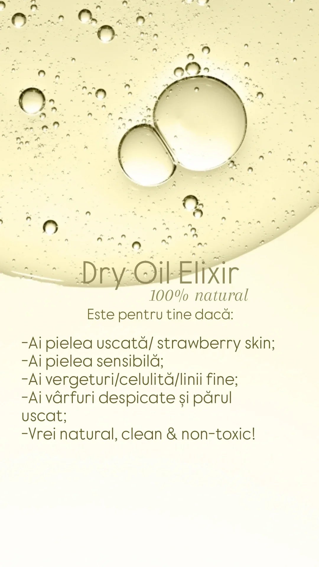 Uleiul uscat elixir multifuncțional este o formulă ușor de aplicat, pe față, corp și păr care se absoarbe rapid, fără a lăsa senzație uleioasă. Este un produs multifuncțional care hrănește, hidratează și calmează pielea, având și efecte regenerante.